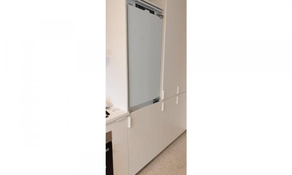 Pri stranki smo uspešno zmontirali vgradni kombinirani hladilnik z zamrzovalnikom, pri katerem se kuhinjska vrata odpirajo v t. i. škarjastem sistemu (pantni sistem). Gre za montažo, kjer so vrata kuhinjskega elementa neposredno pritrjena na vrata hladilnika, zato je natančnost ključna.