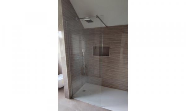 Na steno smo namestili aluminijasti nosilni profil ter ga pritrdili z ustreznimi vijaki prilagojenimi za keramične ploščice. Stekleno tuš steno smo varno vpeli v profil, nato pa jo dodatno stabilizirali z zgornjo podporno konzolo. Na mestih stika smo nanesli sanitarni silikon, ki preprečuje zamakanje in omogoča enostavno čiščenje.