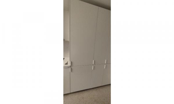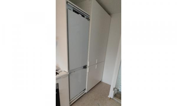 Pri stranki smo uspešno zmontirali vgradni kombinirani hladilnik z zamrzovalnikom, pri katerem se kuhinjska vrata odpirajo v t. i. škarjastem sistemu (pantni sistem). Gre za montažo, kjer so vrata kuhinjskega elementa neposredno pritrjena na vrata hladilnika, zato je natančnost ključna.